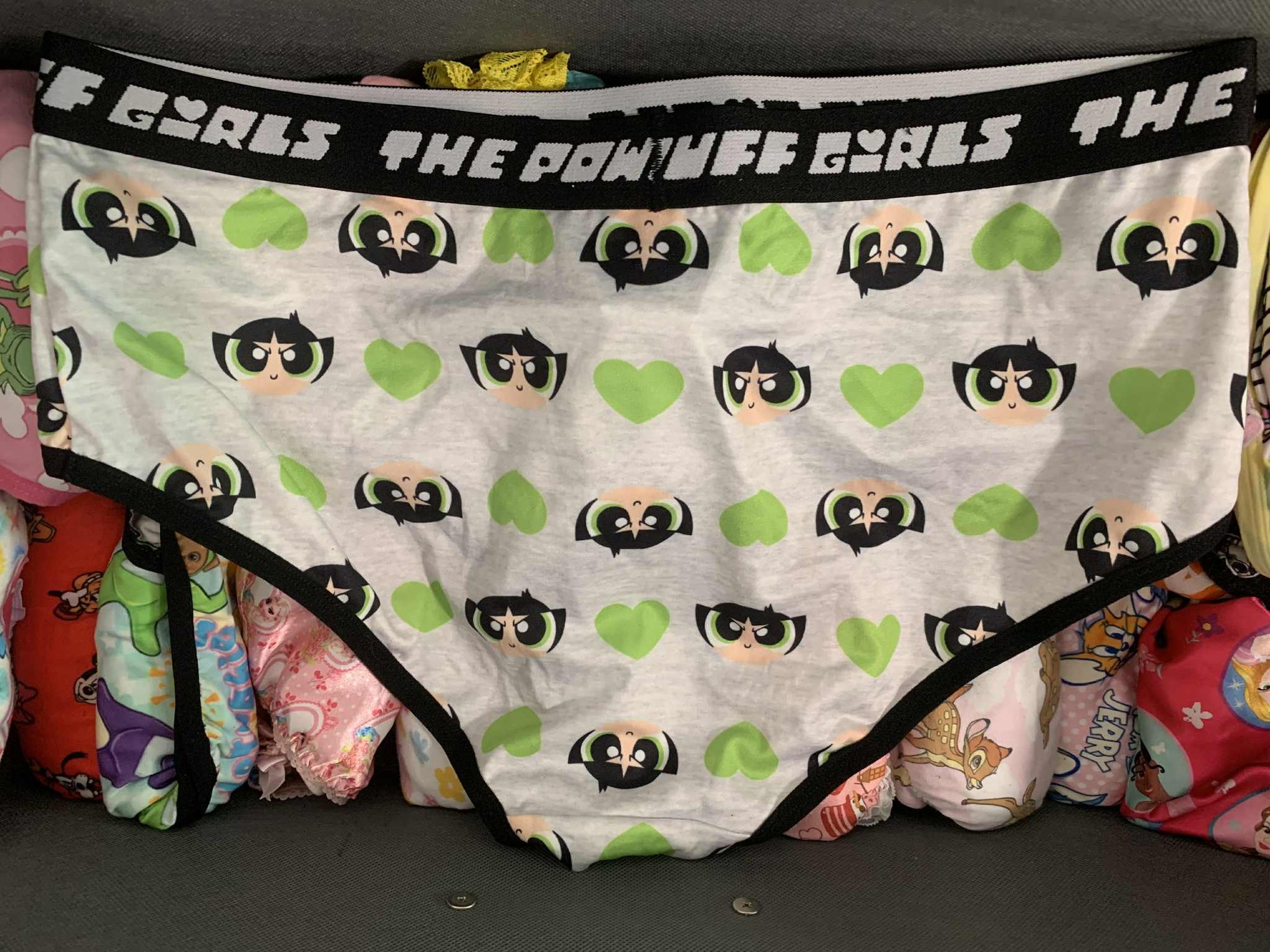 This soft grey pair features a bold, oversized print of Buttercup’s head, her signature scowl made all the more charming against the gentle backdrop of bright green hearts scattered across the fabric. The contrast between the muted base and the vibrant accents gives the knickers a playful, almost cheeky personality. Comfortable, stretchy, and subtly adorable, they offer a spirited, tomboyish twist while still feeling unmistakably girlish. Perfect for anyone who wants a hint of attitude wrapped in something irresistibly cute.