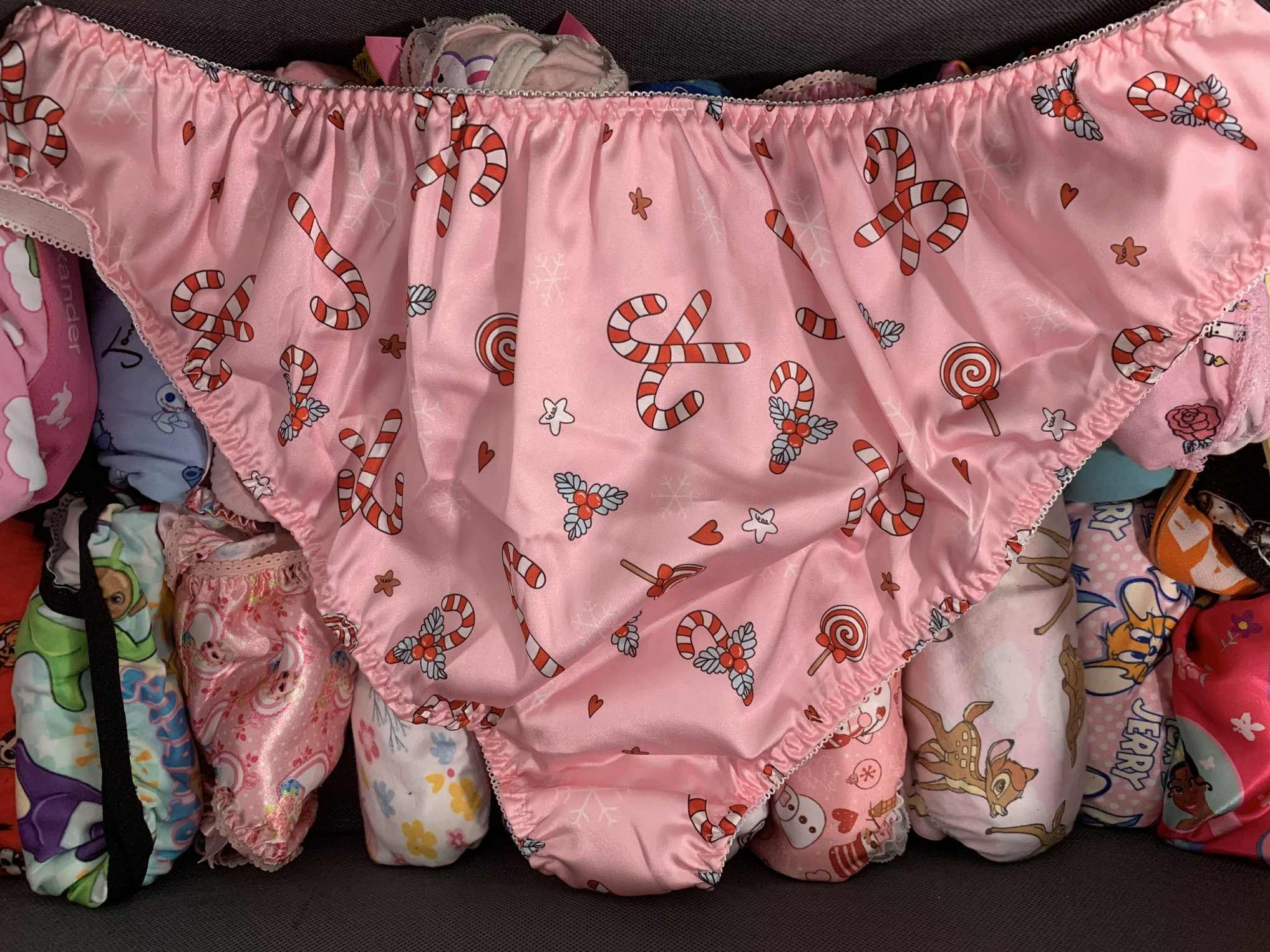 Get wrapped up in holiday sweetness with these luxurious, silky satin briefs! The smooth pink fabric is delightfully covered in a charming, vibrant print of red and white striped candy canes, mistletoe, and swirling lollipops. This classic brief offers a chic, full-coverage cut, accented by sweet white lace trim and finished with a delicate satin white bow centered at the waistband. Perfect for festive fun or a sugary sleepover!